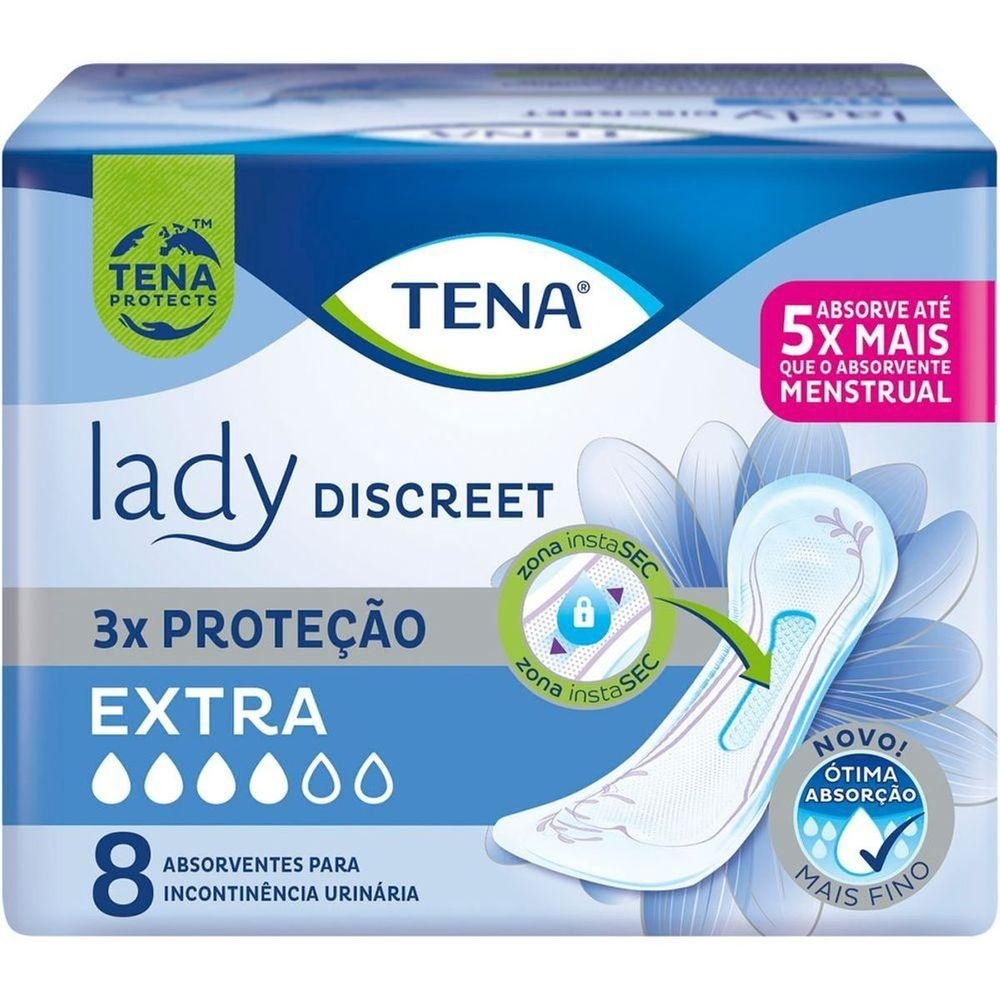 DESCRIÇÃO:Tena Lady Discreet Extra é um produto exclusivo para mulheres com incontinência urinária,que tem mobilidade. Indicado para casos de incontinência moderada, absorve 5x mais que o absorvente menstrual, tem controle de odor, maior segurança contra vazamentos e a pele sempre seca.AÇÃO/ATIVOS:Celulose, polietileno, propileno, adesivos termoplásticos, papel siliconado, polímero superabsorvente e agente controlador de odor.MODO DE USAR:Retire a fita adesiva que o envolve na parte de trás. Pressione sob o centro da sua roupa íntima, até que ele fique fixado nela.ESTE ANÚNCIO CONTÉM: 01 UNIDADES DE TENA LADY ABSORVENTE EXTRA C/8