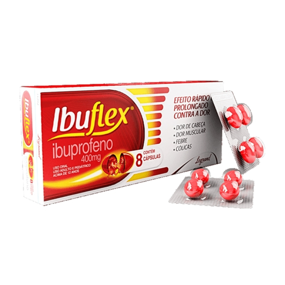 Ibuflex 400mg 8 Cápsulas Gel É UM MEDICAMENTO. SEU USO PODE TRAZER RISCOS. PROCURE O MÉDICO E O FARMACÊUTICO. LEIA A BULA. SE PERSISTIREM OS SINTOMAS, O MÉDICO DEVERÁ SER CONSULTADO. Não use este medicamento em casos de úlcera, gastrite, doença dos rins ou se você já teve reação alérgica a antiinflamatórios.